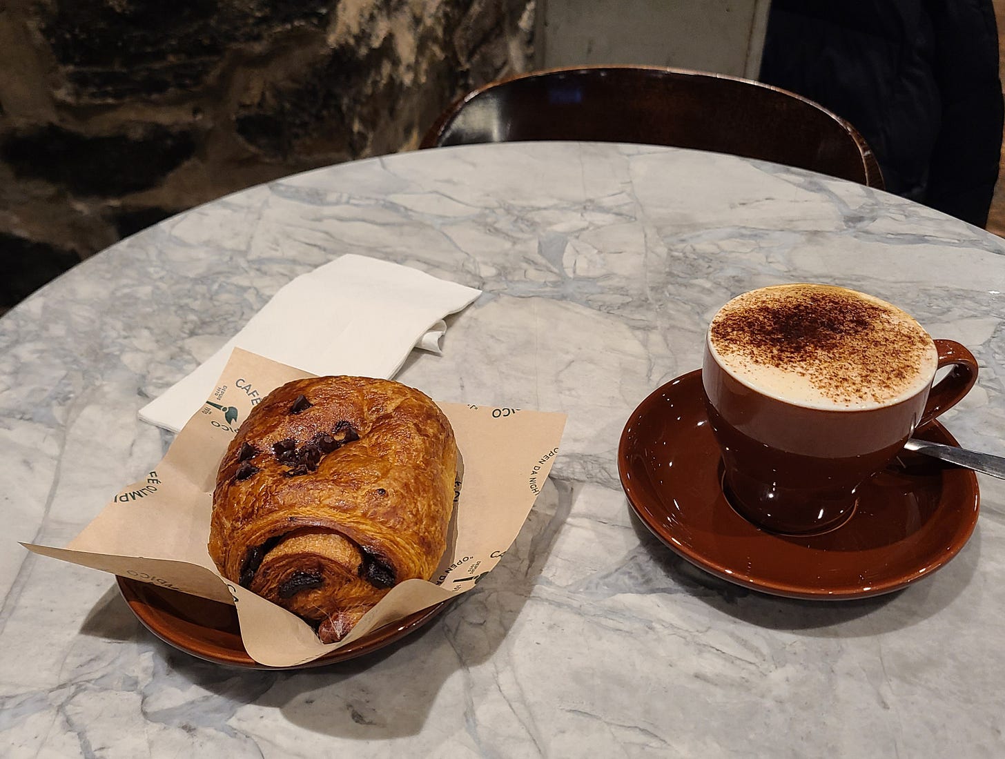 I tuck myself away, finding momentary heaven in a chocolate croissant and decaf cappuccino